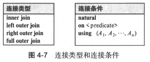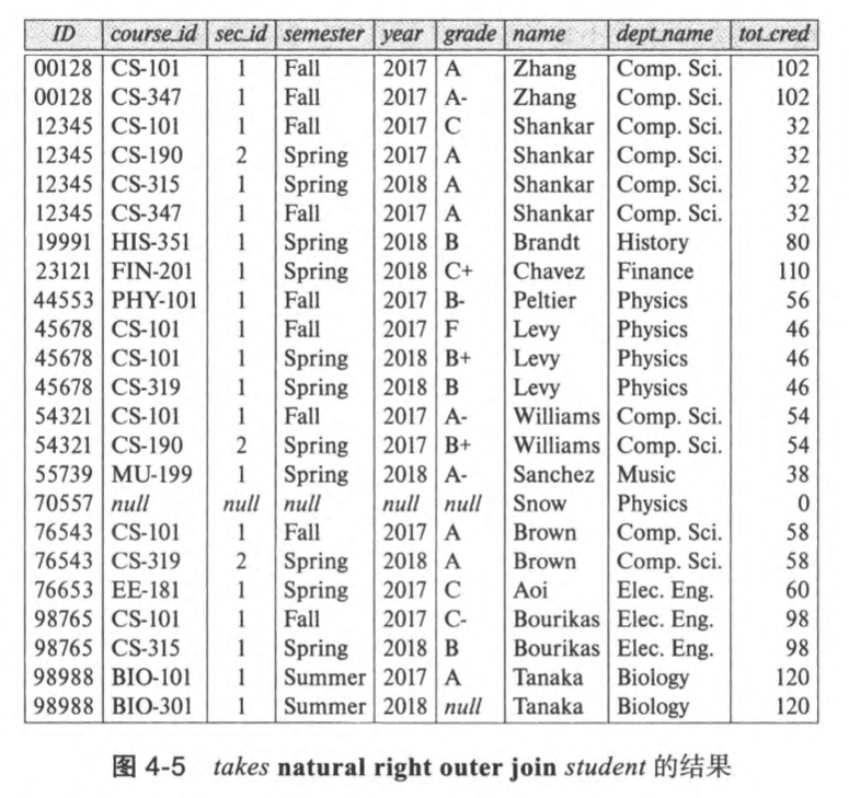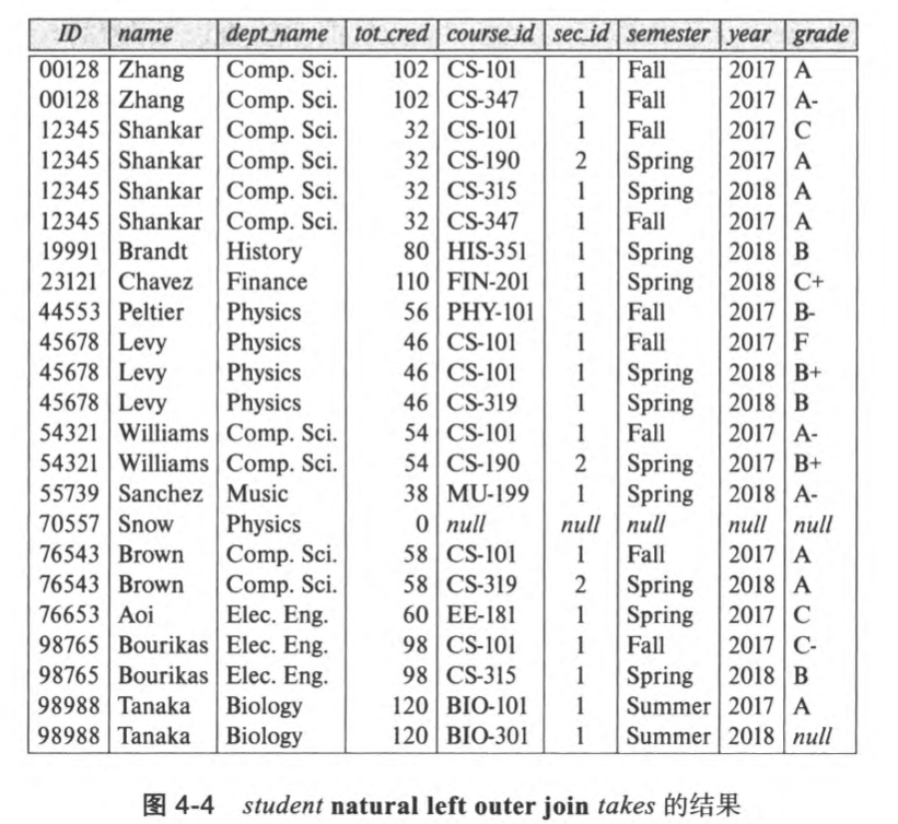 left/right/full outer join...on <谓词>:不仅返回满足连接条件的行,还会返回部分未匹配的行,自动用空值填充缺失的属性