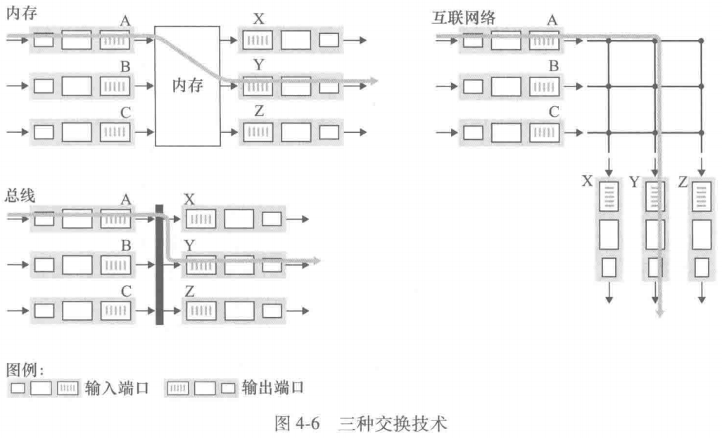 | 经总线交换 | 通过一个共享的总线在输入端口和输出端口之间传递 | 并发转发,一次只有一个分组能跨域总线,总线的带宽决定了交换速度 |